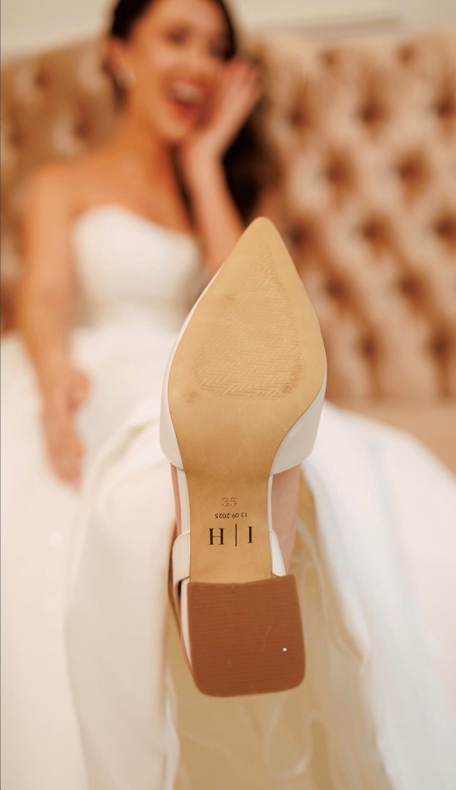 Personalização na sola do sapato, com as iniciais da noiva e do noivo e a data do casamento. Um detalhe exclusivo que transforma o sapato em uma lembrança eterna desse momento tão especial, unindo estilo, significado e memória afetiva.